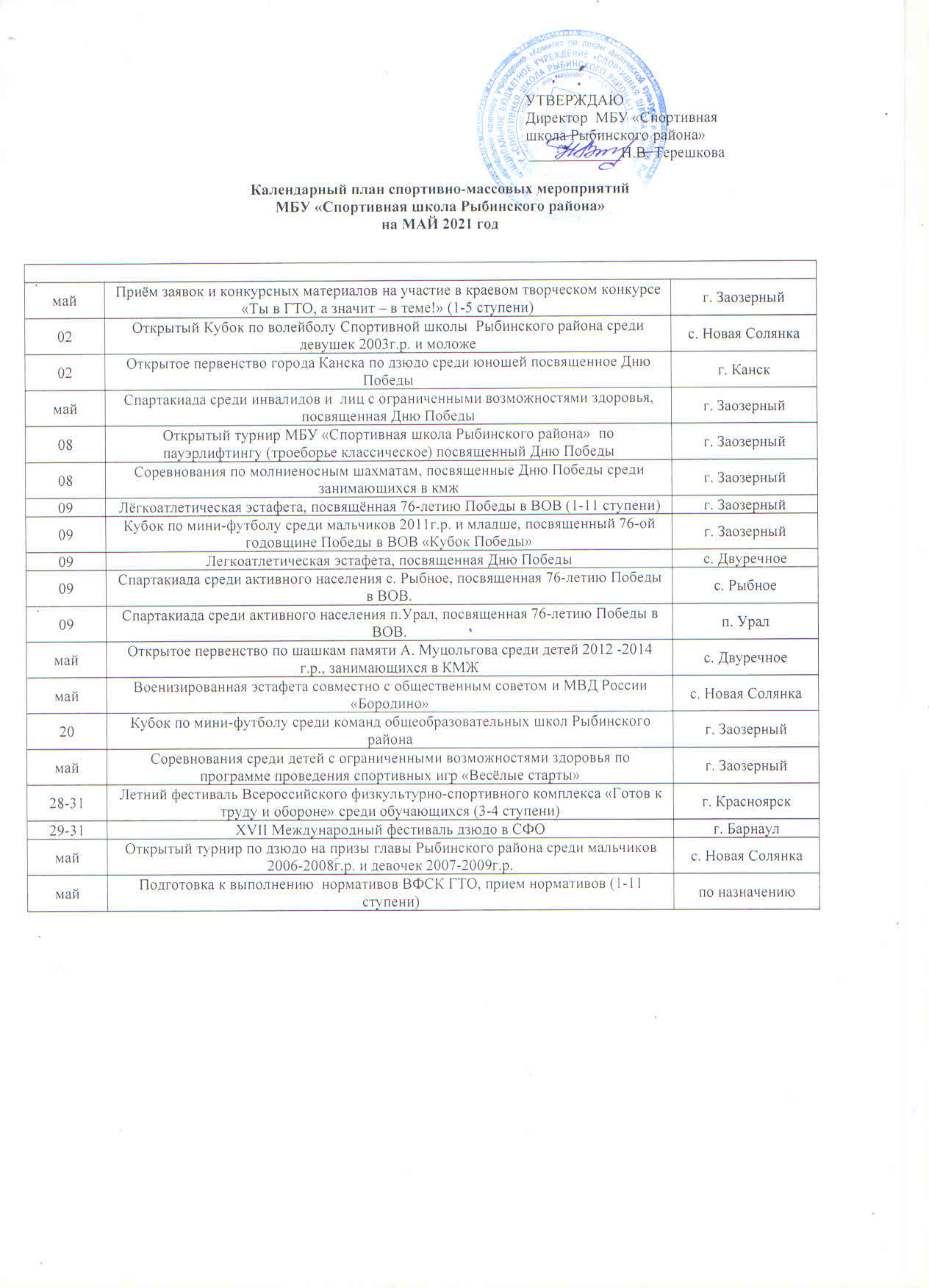 ПЛАН СПОРТИВНО-МАССОВЫХ МЕРОПРИЯТИЙ НА МЕСЯЦ МАЙ 2021г